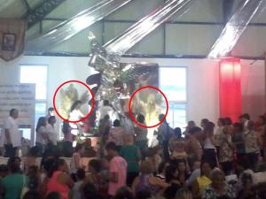 Hoje estou aqui para relatar um fato impressionante que aconteceu no Santuário São Miguel Arcanjo, em Bandeirantes, no Norte do Paraná. Alguns dias atrás, fiéis já postaram fotos nas redes sociais, com aparições no altar do Santuário. No dia 28/02/2015 participei da Missa de Cura e Libertação juntamente com meu filho, sua namorada e amigos. Meu filho Hilário e sua namorada Karla estavam participando de uma Missa no Santuário pela 1º primeira vez, foram colocar seus pedidos junto à imagem de São Miguel Arcanjo que fica no altar do Santuário, no caminho fizeram várias fotos, onde também foi registrado aparições. Por isso, estou compartilhando as fotos com vocês.