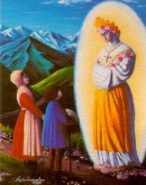 Enquanto desciam a montanha, viram em um lugar muito abaixo delas uma bola de luz radiosa, parecia que "o sol havia caído lá". E eis que o globo se abriu e, em frente aos seus olhos, apareceu uma silhueta humana. A figura assumiu a forma de uma "bonita senhora" "toda luz e flores.", sentou nas pedras da fonte com os cotovelos nos joelhos e a cabeça entre as mãos, em uma postura de tristeza e lágrimas. As duas pequenas crianças ficaram aterrorizadas, enquanto a "bonita senhora" se levantou: ela era alta e majestosa. Elas viram que ela permaneceu suspensa no ar sem tocar o chão. Havia dois halos luminosos em sua cabeça e o seu hábito branco estava brilhando com pérolas. Mas o seu rosto estava triste. Ela disse que as crianças não puderam entender imediatamente.