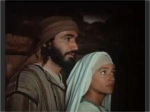 José vem entrando. Parece que está vindo da cidade, porque está entrando pela porta da casa, e não da oficina. Maria levanta a cabeça e sorri para ele. José retribuiu ao sorriso dela...mas parece que ele faz isso como quem está cansado, preocupado. Maria observa isso. Depois, ela se levanta para pegar o manto, que José está tirando, o dobra e o coloca sobre um baú.
