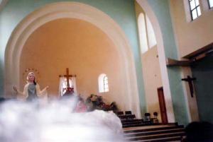 Foto tirada em 1994 por padre italiano dentro da igreja de Medjugorje mostrando uma nuvem embaixo da estátua da Rainha da Paz