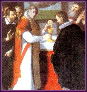 Enquanto celebrava uma missa e dizia: “Este É o meu corpo..., Este É o meu sangue...”, então, sangue começou a jorrar da hóstia e a pingar sobre o altar.