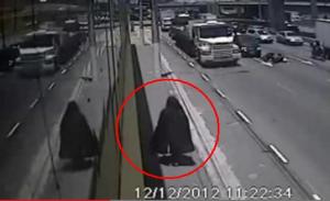 Outros detalhes importantes à salientar são: As motocicletas que trafegam nestes corredores, especificamente a quinta motocicleta; movimento zero de pedestres na calçada; câmera de transito que esta fixada no lado esquerdo do prédio espelhado, com cronometro marcando data, hora, minuto e segundo, inclusive sua fachada de vidro reflete novamente o trafego dos veículos; observe o que aparece abaixo da câmera nos exatos 11:22:29.(É importante citar o ponto da câmera e o cronometro, principalmente para deixar bem claro que não houve uma edição de imagens. Pois poderia muito bem alguém inserir uma imagem sobreposta porem interferiria na hora o resultado do numero do cronometro que pulariam obviamente para um período muito maior); observem que o cronometro segue gradativamente cada minuto e segundo sem que se altere uma única fração de segundo; observe que a imagem que você verá passar debaixo da câmera ficará refletida espontaneamente e acompanhará os movimentos do "transeunte" até o mesmo sumir de vistas bem à frente-(outro detalhe, uma imagem sobreposta não teria como fazer refletir no vidro conjuntamente); você poderia dizer que o transeunte, naturalmente pode-se tratar de uma pessoa qualquer ou até um andarilho ( porem, qual ser humano resistiria ou se proporia andar em plena marginal Tietê, naquele horário de sol escaldante, sensação de temperatura de 45/50 graus,com + um tremendo casaco preto, e por cima com capuz baixado.