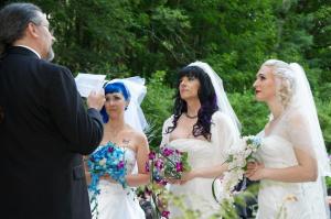 Doll, Kitten e Brynn, de Massachusetts, EUA, se uniram em uma cerimônia em agosto de 2013, mas só agora decidiram contar sua história.Cada uma delas, vestida de branco, foi levada por seus pais até o altar onde trocaram votos e alianças.