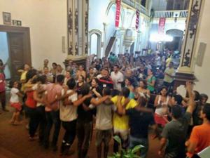 Espacojames: O gesto é bom, mas fico com o comentário do Padre Marcelo (Cito abaixo). Não é correto realizar cultos evangélicos dentro da Igreja Católica, poderia apenas ter cedido um espaço ao lado, ou em um barracão, mas não dentro da Igreja. As imagens de Jesus e Maria foram retiradas para a realização do culto (com certeza para não correrem o risco de serem quebradas ou escarnecidas... E o sacrário? ).