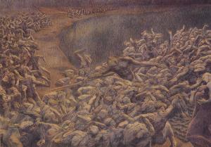 E Ele me disse: Ao inferno eles vêm em corpo e alma, como também ao céu se vai assim. Estamos agora apenas no primeiro inferno, e estes já foram julgados. São aqueles que viveram na terra desde a criação do homem até o dilúvio. Então os demônios colocaram os condenados em cima de uma chapa como de zinco galvanizado, e os trinchavam e despedaçavam, cada um por dois ou três demônios. Depois, tendo uma ferramenta como uma grande corta-unhas, eles prendiam pedaços de carne dos condenados, iam lhes arrancando as unhas, os dedos, os pelos, entre gritos de desespero e atrozes lamentos.