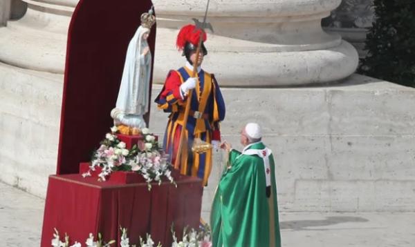 Diante de aproximadamente 100 mil pessoas presentes na praça de São Pedro, em 13 de outubro de 2013, o papa Francisco consagrou o mundo à proteção de Nossa Senhora de Fátima.