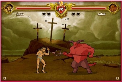 Jogos infernais (Jesus X Satã - Observem a cruz vazia logo atrás, insinuando que Cristo desceu da cruz para lutar com satanás )