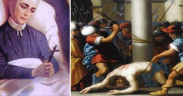 “Então vi, conta ela mesma, vindo do Tabernáculo, onde se guardava o Santíssimo Sacramento, o meu Esposo celeste em forma de um jovem resplandecente. Na mão esquerda trazia uma grinalda de flores, na direita uma coroa de espinhos; apresentou-as, ambas, para eu escolher. Tomei a coroa de espinhos, Ele a pôs na minha cabeça e eu a apertei com ambas as mãos; depois desapareceu e voltei a mim, sentindo uma dor veemente em torno da cabeça.