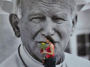 Fiel passa diante de imenso retrato do Papa João Paulo II na Cracóvia, Polônia, na quinta (28) (Foto: Bela Szandelszky / AP).