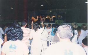 Esta foto foi tirada por mim em Fortaleza-CE, em 2001, no Fórum Carismático Shalom (Comunidade Católica Shalom), no momento da elevação da Hóstia e do Cálice. A Santa Missa era votiva ao Espírito Santo.