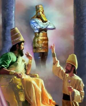 Procurando Arioque, que tinha ordens de matar todos os sábios, pe diu que suspendesse as execuções e solicitou uma entrevista com o tira no (Dn 2:24,25). Sem acanhamento, Daniel diz ao soberano que, como só Deus podia revelar os mistérios, o misterioso sonho fora revelado não por sabedoria do profeta, mas por divina revelação (2:28). Então passa a narrar uma das maiores visões apocalípticas dadas ao homem. Nabucodonosor deve ter ficado estu pefato ao ouvir Daniel reconstituir o sonho e depois esboçar o começo, o meio e o fim da história e do domí nio gentílico. O colosso metálico, com cada parte de um material diferen te, simbolizava quatro reinos suces sivos e o reino final e definitivo de Deus, “a pedra que feriu a estátua [,e] se fez um grande monte, e en cheu toda a terra” (2:35).