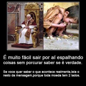 Em primeiro lugar deveríamos analisar quais são estas riquezas que tanto se fala. Por acaso roupas litúrgicas valem alguma coisa? Símbolos religiosos? O dinheiro direcionado à caridade é usufruído pelo papa no lugar de ajudar os outros?