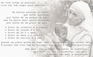 2) A maior doença do Ocidente hoje não é a lepra nem a tuberculose; é ser indesejado, não ser amado e ser abandonado. Nós podemos curar as doenças físicas com a medicina, mas a única cura para a solidão, para o desespero e para a desesperança é o amor. Há muitas pessoas no mundo que estão morrendo por falta de um pedaço de pão, mas há muito mais gente morrendo por falta de um pouco de amor. A pobreza no Ocidente é um tipo diferente de pobreza – não é só uma pobreza de solidão, mas também de espiritualidade. Há uma fome de amor e uma fome de Deus.
