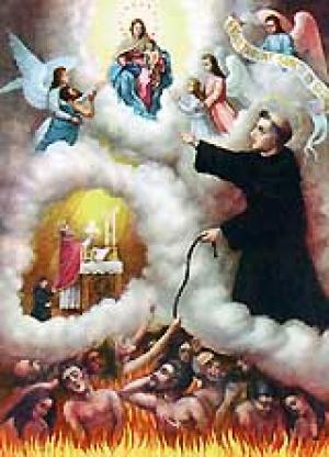 Com todo o afeto de minha alma te rogo que interponhas tua poderosa intercessão em favor dessas almas benditas, conseguindo da divina clemência a remissão de todos os seus delitos e suas penas, para que saindo daquele tenebroso cárcere de dores, possam a ter no céu a visão beatífica de Deus.