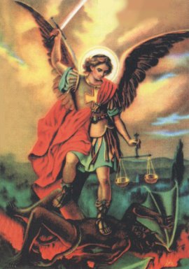 Vi novamente a Igreja de São Pedro com sua grande cúpula. Sobre ela resplandecia o Arcângelo São Miguel vestido de cor vermelha, tendo uma grande bandeira de combate nas mãos. A terra era um imenso campo de batalha. Os verdes e azuis lutavam contra os brancos e estes sobre os quais havia uma espada de fogo parecia que iam sucumbir; nem todos sabiam por que causa combatiam.