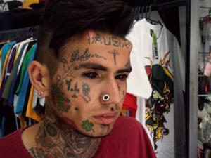 Sequência de modificações corporais A primeira modificação corporal foi aos 11 anos, quando Bruno colocou o primeiro piercing, no nariz. Em seguida, vieram as tatuagens. As estrelas tatuadas em uma das coxas, aos 13, foi o primeiro contato que o jovem teve com a introdução de pigmentos por agulhas. “Hoje, sei que tenho pelo menos oito piercings. Quanto às tatuagens, já perdi as contas. No rosto, sei que são quase 20”, afirma.