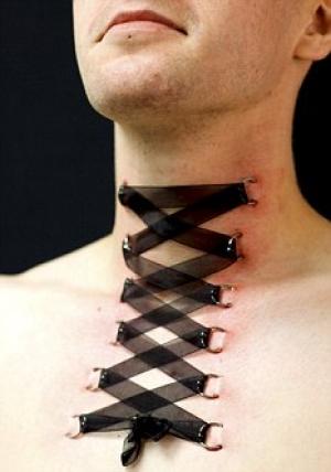Esqueça tatuagens, piercings no umbigo e implantes de silicone estilo Lady Gaga – a última moda em modificação corporal é o “corset piercing”, onde anéis de metal são perfurados na pele e unidos por uma fita para dar um efeito de espartilho.