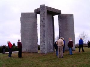 Você deve estar se perguntando por que nunca tinha ouvido falar de um monumento construído na maior economia do mundo. Uma obra que conclama a redução drástica da população, uma nova religião, um governo mundial baseado na histeria ambientalista e no abusivo jogo de palavras que sugere harmonia, mas oferece escravidão. Em toda a história humana os tiranos chegaram ao poder um futuro melhor que jamais chegou, em troca pedem mais sacrifício e menos liberdade em nome da harmonia e das futuras gerações. Se você nunca ouviu falar nas Pedras Guia da Geórgia é porque a grande mídia tem distrações elaboradas a desviar a sua atenção como um novo reality show ou as declarações da sensação do último campeonato.