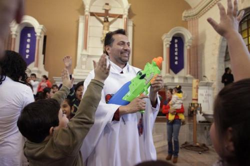 Padre Humberto segura a arma de brinquedo com água benta durante a missa (Foto: Daniel Becerril/Reuters)