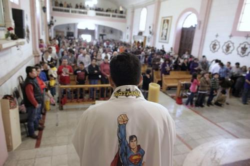 A arma de brinquedo e a batina com a figura do Batman e do Super-Homem são usadas durante as missas voltadas para as crianças. Nas celebrações normais, o padre usa suas vestes habituais.