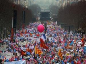 A controversa legislação que permitirá o casamento `gay` e a adoção de crianças por casais do mesmo sexo foi aprovada recentemente pelo parlamento francês e será examinada e submetida a aprovação do senado em abril, pelo que os ativistas consideram esta a última possibilidade de se manifestarem contra a referida lei.