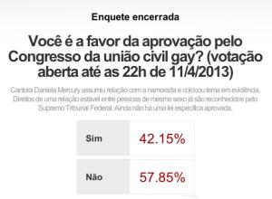O site de notícias G1, que pertence ao grupo Globo, realizou uma enquete entre seus leitores sobre à união civil entre homossexuais depois que a cantora Daniela Mercuri colocou o tema em pauta nos jornais ao assumir sua relação lésbica com uma jornalista. (Veja o resultado na figura acima e atente para o número de publicações que houve no Facebook e no Twitter)