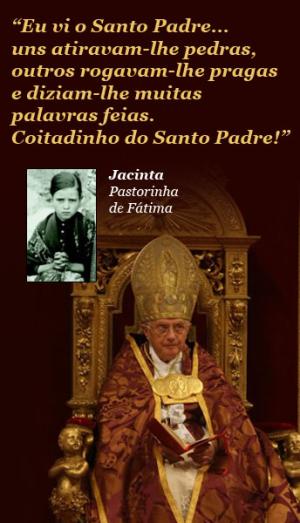 “Eu vi o Santo Padre numa casa muito grande, de joelhos diante de uma mesa, com as mãos no rosto a chorar; fora da casa estava muita gente e uns atiravam-lhe pedras, outros rogavam-lhe pragas e diziam-lhe muitas palavras feias. Coitadinho do Santo Padre, temos que pedir muito por ele!”
