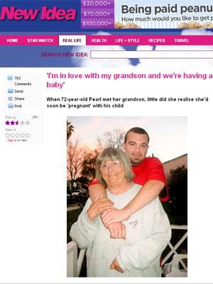 Pearl Carter, de 72 anos, está enfrentando muitos olhares tortos nos Estados Unidos desde que assumiu o namoro com seu neto, Phil Baile, de 26 anos. Como se não bastasse, o polêmico casal ainda terá um filho concebido com a ajuda de uma barriga de aluguel. A história foi publicada pela revista neozelandesa “New Idea”.