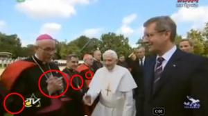 O Papa Bento estava apresentando os bispos alemães ao Presidente da Alemãnha, na verdade alguns bispos cometeram uma gafe pegando na mão do papa.