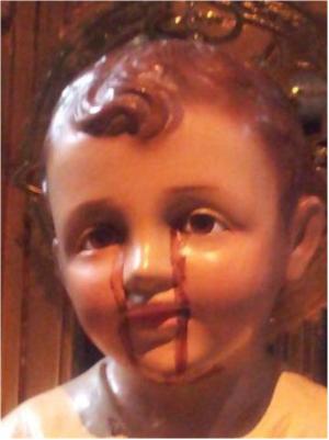 Perturbou-se, pensando que era a voz de sua mãe defunta. Depois foi abrir o embrulho que trouxera de Israel: E eis que a estátua tinha chorado lágrimas de sangue! Chamou o Bispo que, nesse dia, estava no convento. Também ele constatou as lágrimas muito frescas no rosto de Jesus. Foram logo chamadas as autoridades, peritos, etc.