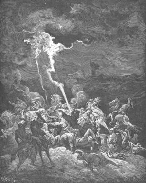 Elias respondeu: Se sou um homem de Deus, venha fogo do céu e vos devore, a ti e aos teus cinqüenta homens. E o fogo, caindo do céu, devorou o chefe e seus cinqüenta homens.