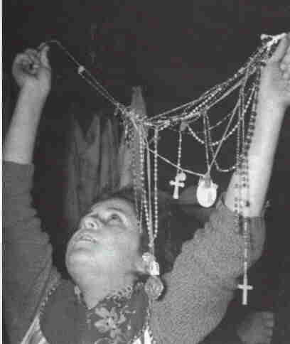 Vidente levantando o rosário para Nossa Senhora Beijar