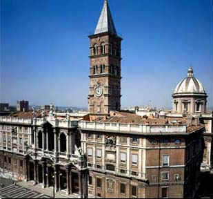 Essa é basílica de Santa Maria Maggiore, foi construída no séc. IV pelo Papa Libério, inspirado por um sinal da Virgem, que fez nevar neste local em pleno verão de Roma. É a primeira Igreja dedicada a Virgem Maria no Ocidente, e uma das mais belas e adornadas de toda a cidade. Abriga entre outras coisas um relicário com um pedaço da manjedoura do menino Jesus.