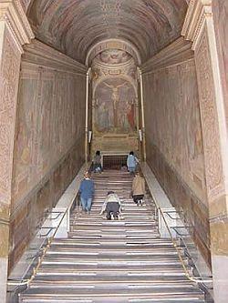 A pequena distância da magnífica Basílica de São João de Latrão, poderá o fiel devotamente subir de joelhos os degraus da Escada Santa, levada de Jerusalém para Roma, Trata-se da escada do Palácio de Pôncio Pilatos, pela qual subiu Jesus quando foi apresentado à turba ululante depois da Flagelação. – o “Ecce Homo”. Inclusive, estão assinalados três pontos onde se vê a marca do divino sangue sobre o mármore branco dos degraus, agora revestidos de madeira.