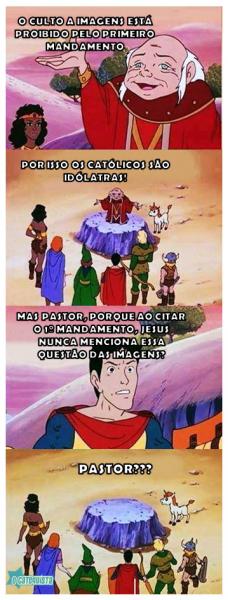 Será que fui só eu que notei que Jesus NÃO considera a condenação do culto a imagens um ponto integrante do Primeiro Mandamento? Ah, vejo que não estou sozinha; esse protestante aqui embaixo acaba de cair na real… Alguém traz uma água com açúcar pro rapaz!