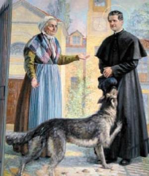 Dom Bosco, Mama Margarida e o cão Grigio (pintura da casa-mãe dos Salesianos, Turim, Itália)