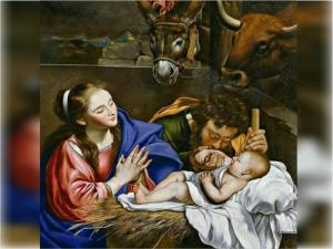 Ao inclinar-se para beijar-lhe os pezinhos, percebe que eles estão frios e, então, senta-se no chão e o põe em seu colo e, com a veste marrom e com suas mãos, procura cobri-lo, aquecê-lo e defendê-lo do vento frio da noite. Ele bem que gostaria de ir para perto do fogo, mas por lá passa aquela corrente de ar, que entra pela porta. É melhor ficar entre os animais que servem de escudo contra o ar, e que produzem calor. E, assim pensando, vai ficar entre o boi e o jumento, e se coloca com as costas para a porta, inclinando-se sobre o Recém-Nascido, fazendo do seu peito um nicho, cujas paredes laterais são: uma cabeça cinzenta com longas orelhas e um grande focinho branco, com um nariz que solta um vapor quente, e com os olhos úmidos e cheios de bondade. Maria abriu o baú, e dele tirou linhos e cueiros. Depois foi para perto do fogo e aqueceu os paninhos. Agora Ela vai a José, envolve o Menino naqueles tecidos mornos e no seu véu para proteger-lhe a cabecinha.