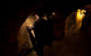 Judeus ultra ortodoxos rezam em túnel do Muro das Lamentações na cidade Antiga de Jerusalem.