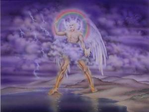 Um anjo forte desceu do céu. Vestido de uma nuvem, com um arco celeste por cima de sua cabeça, seu rosto era como o Sol, e os seus pés como colunas de fogo. Na sua mão, um livrinho aberto.
